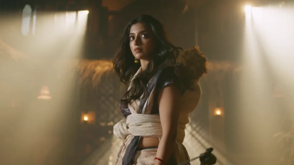 Meanwhile, in a hidden jungle, Gauri is alive and living with her young son, Golu. She’s a strong mother who will do anything to keep Golu safe from danger. Golu, a playful and magical child, is floating in the air, which makes Gauri both proud and worried. She calls out to him, “Golu, come down right now, or I’ll tie you to the cradle next time!” Her voice is firm but full of love. To calm him, Gauri sings a sweet lullaby, calling Golu her “chanda” (moon) and “suraj” (sun). The song is so beautiful that Golu floats down, giggling, and they play together. Gauri’s heart swells with joy, knowing Golu is her everything, the light that keeps her broken heart strong.