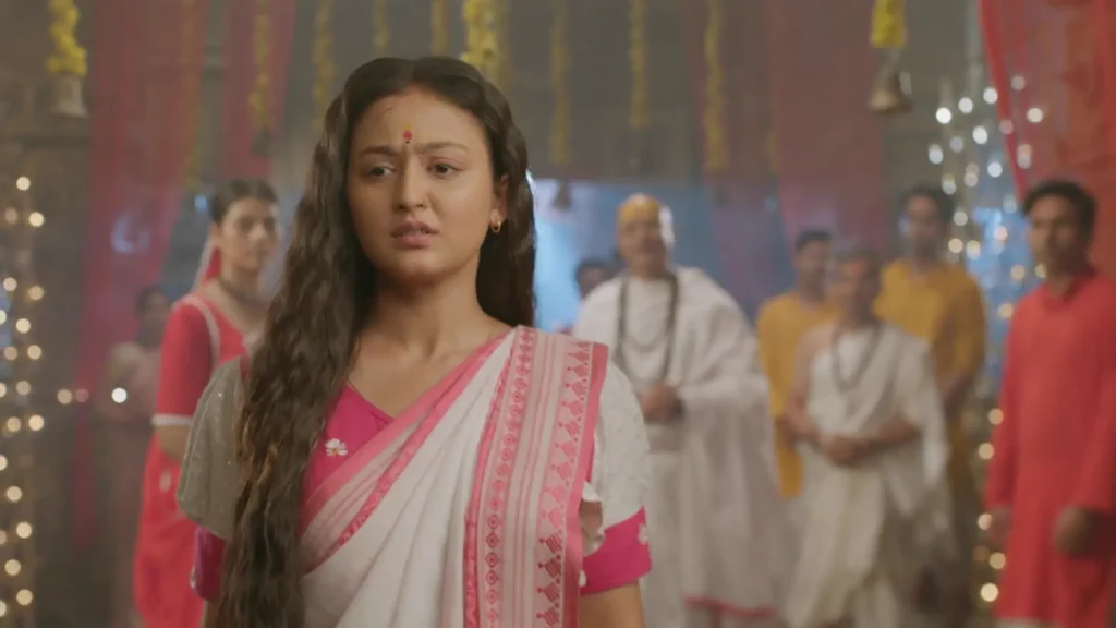 Back at the temple, Gurudev and Poulomi are talking about Noyontara. Gurudev is thrilled that Surjo and Noyontara met by chance, calling it Baba Bhootnath’s miracle. He believes Noyontara is Surjo’s protector, even if she says she gave up her powers. Poulomi isn’t sure if Noyontara still has her divine gift, but Gurudev insists that Baba Bhootnath’s chosen one can’t just give back such a blessing. He plans to visit Pari Mahal the next day to propose a marriage between Surjo and Noyontara, believing it’s the only way to save Surjo from danger. Meanwhile, Noyontara, standing outside Komal’s house, decides to tell her family she can no longer see spirits, hoping it will bring them peace. But as she steps forward, Poulomi’s warning echoes in her mind, making her pause with fear.