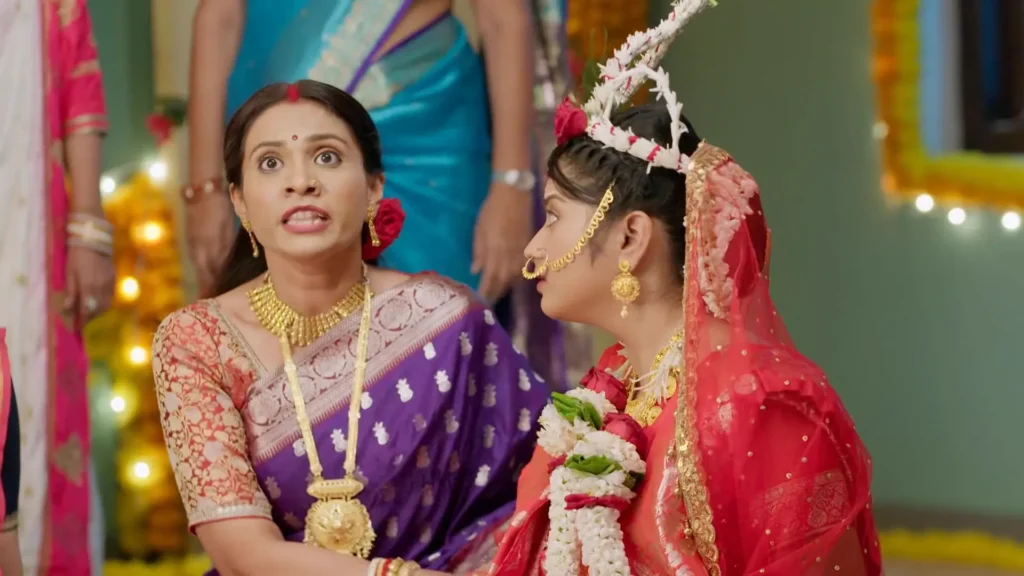 Surjo asks Noyontara why she was running like that. She nervously glances at the car that was following her, but it’s gone now. She tells Surjo she doesn’t know why someone was chasing her. Surjo, being caring like an elder brother, offers to take her home, but Noyontara says she doesn’t know where to go. She shares her sadness about Komal’s broken engagement, thinking it’s because of her. Surjo, with a warm smile, surprises her by saying Komal’s wedding actually happened! He explains that he convinced the groom’s family to go ahead with the marriage. Noyontara’s eyes light up with joy, and she calls Surjo an angel sent by Baba Bhootnath to save her family. She feels a huge weight lift off her heart, like a rainy cloud moving away to show the sun.
